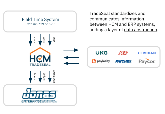 HCM TradeSeal ensures your data can be managed consistently between your Jonas ERP system and your Human Capital Management (HCM) system. While ERP systems excel at project management, job costing, billing and other critical functions, they are not designed to manage Human Resources, Payroll and Payroll tax compliance issues.